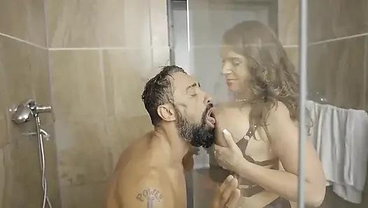 Gilf ve orta yaşlı seksi kadın akşam yemeği için üçlü grup seks yapıyor
